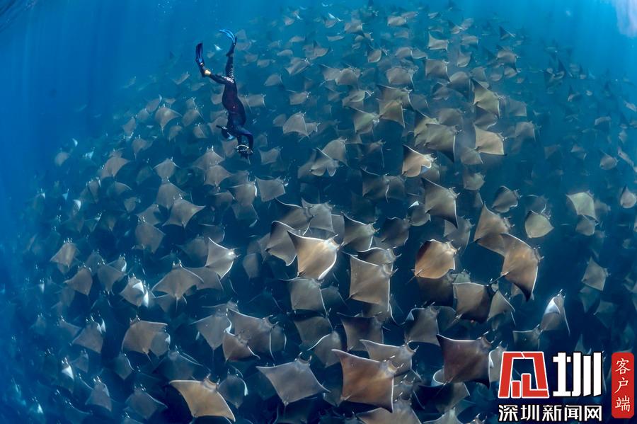 2019年5月31日報道(圖片拍攝于4月23日),環(huán)保活動家兼潛水教練Jay Clue上個月在墨西哥下加利福尼亞州洛斯卡沃斯附近海岸,幸運地邂逅了一支蝠鲼遷徙大軍,數百只蝠鲼浩浩蕩蕩在海水中行進,畫面十分震撼。