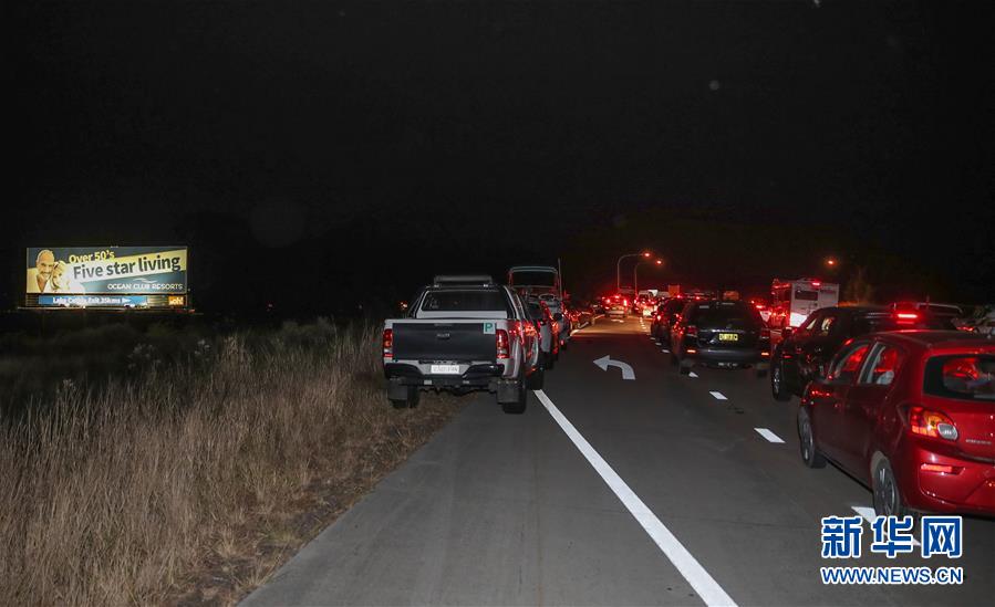 11月10日夜間,在澳大利亞新南威爾士州塔里附近道路上,由于山火封路,當(dāng)?shù)鼐用耨{車(chē)排隊(duì)等待前往避難所。新華社記者白雪飛攝