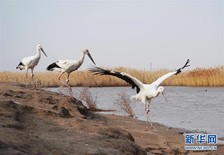 這是在樂亭縣野生動物保護(hù)協(xié)會大清河鳥類救助站放飛回歸大自然的三只國家一級保護(hù)動物東方白鸛(11月16日攝)。新華社記者楊世堯攝