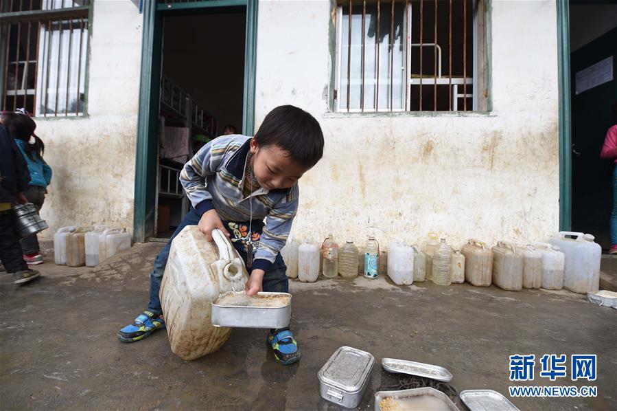 在廣西大化瑤族自治縣板升鄉(xiāng)八好小學,一名學生用儲備在水桶里的雨水淘米煮飯(2014年11月24日攝)。新華社記者黃孝邦攝