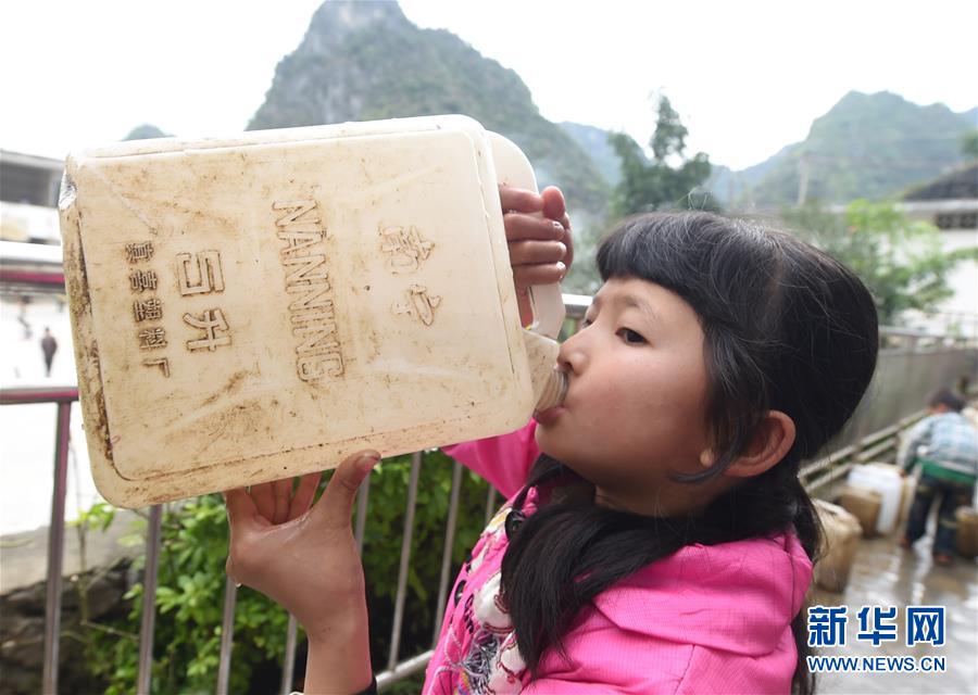 在廣西大化瑤族自治縣板升鄉(xiāng)八好小學,一名學生喝水桶里的雨水(2014年11月24日攝)。八好小學有400多名學生,曾僅有一個不足100立方米的水柜,用于收集儲存樓頂的雨水,學生需定期定量用水。遇到長時間不下雨,學校需要到鄉(xiāng)政府所在地運水。如今,學校修建了5個大水柜,并從兩公里外引泉水到校園,飲水難問題得到解決。新華社記者黃孝邦攝