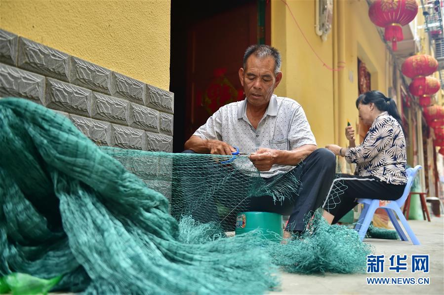 8月22日,福安市下岐村村民在織漁網(wǎng)。新華社記者林善傳攝