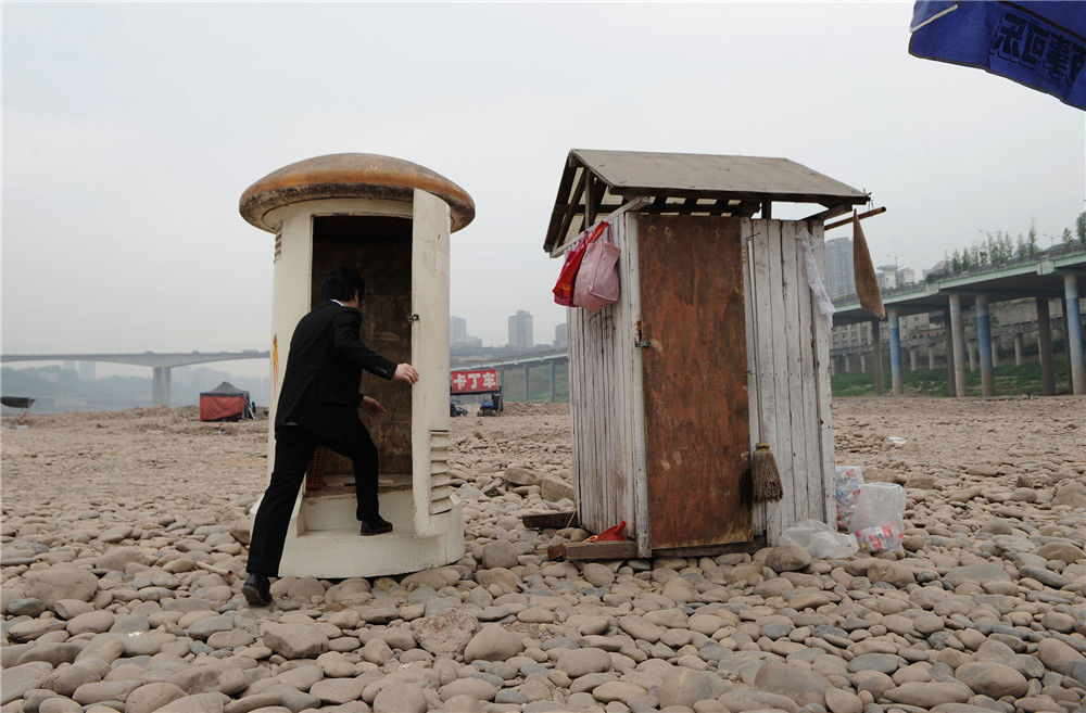 2013年04月02日,重慶,干枯河床上修建了臨時(shí)公共廁所。大動(dòng)/視覺中國