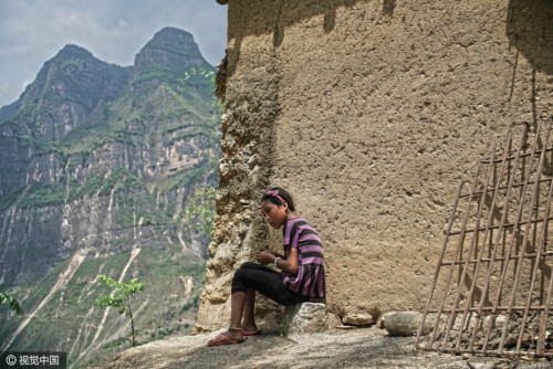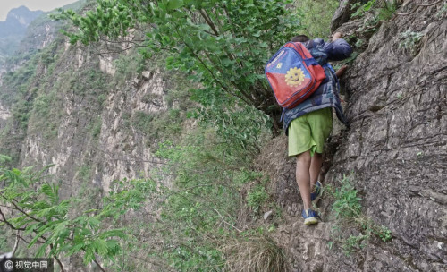 上學的孩子都背著沉沉的書包,大多數(shù)是女孩,15個孩子在三個家長的保護下,大約用了2個小時,到達“懸崖村”。上山容易下山難,遇到雨雪天氣,村里人就不再外出了。圖片來源:視覺中國