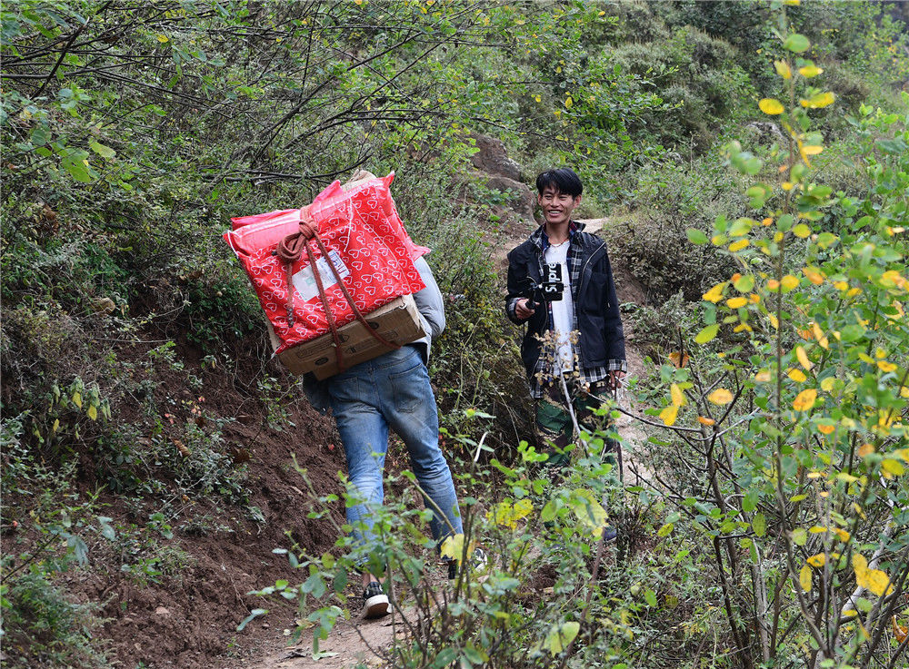 2019年11月16日,四川涼山,楊陽背包裹回家的路上遇見村里正在做直播的年輕人。