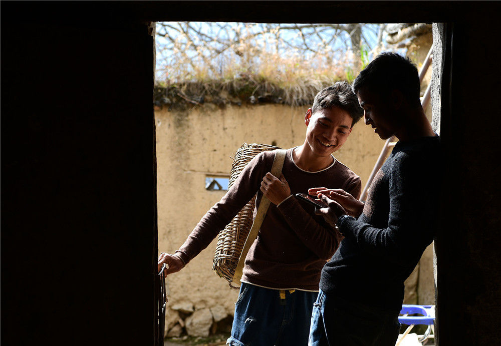2019年11月16日,四川涼山,村里的年輕人一起交流購物經(jīng)驗。