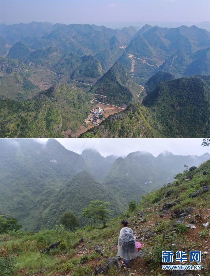 拼版照片:上圖為已經修通公路的大化瑤族自治縣板升鄉(xiāng)弄勇村各自然屯(11月11日無人機拍攝);下圖為在弄勇村弄炮屯,一名小學生爬山路去學校(2016年9月1日攝)。新華社記者黃孝邦攝