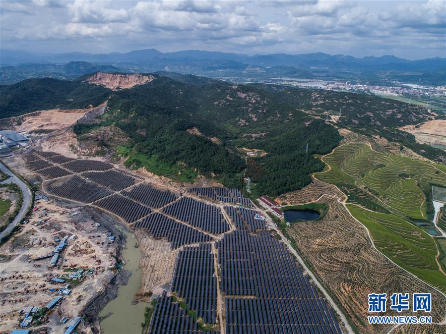 空中俯瞰湖州市埭溪鎮(zhèn)東紅村的光伏發(fā)電站(9月26日無(wú)人機(jī)拍攝)。該光伏電站占地2500多畝,是當(dāng)?shù)貜U棄礦坑通過(guò)改造建成的“農(nóng)光互補(bǔ)”光伏發(fā)電站。