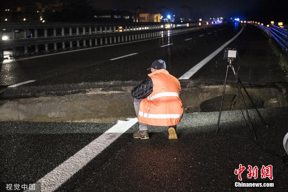 暴雨過后 意大利高速公路出現(xiàn)“大坑”
