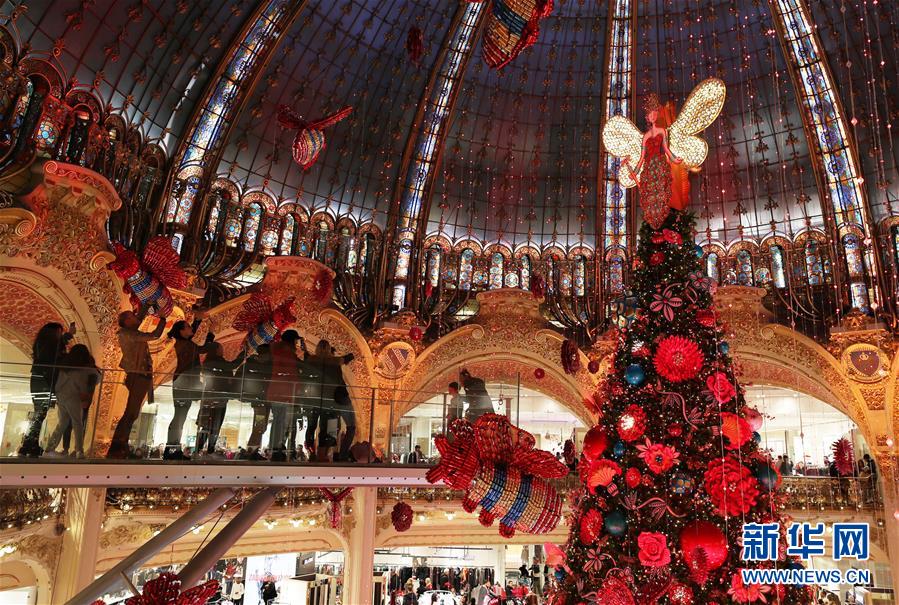 11月24日,在法國巴黎老佛爺百貨公司,人們在玻璃走廊上參觀點(diǎn)燈后的巨型圣誕樹。 新華社記者高靜攝