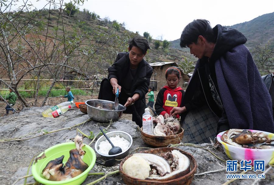 11月24日,在昭覺縣支爾莫鄉(xiāng)阿土列爾村,俄底曲正(左)和阿牛(右)在準備祭祀用的豬肉和羊肉等食物。新華社記者江宏景攝