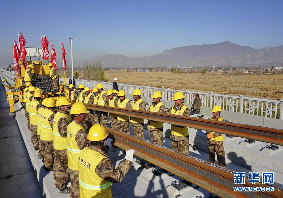 11月1日,中鐵三局的工人在京張高鐵河北懷來段鋪軌現(xiàn)場(chǎng)工作。