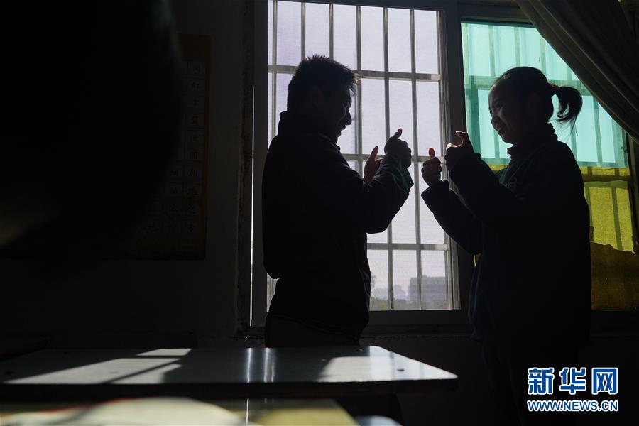 在江西省南昌市三聯(lián)特殊教育學(xué)校,兩名學(xué)生在課后練習(xí)手語(yǔ)(11月22日攝)。