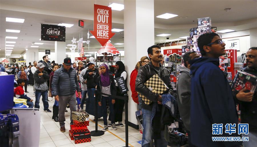 11月28日,在美國加利福尼亞州圣安娜的一家商場,人們排隊結(jié)賬。新華社記者李穎攝