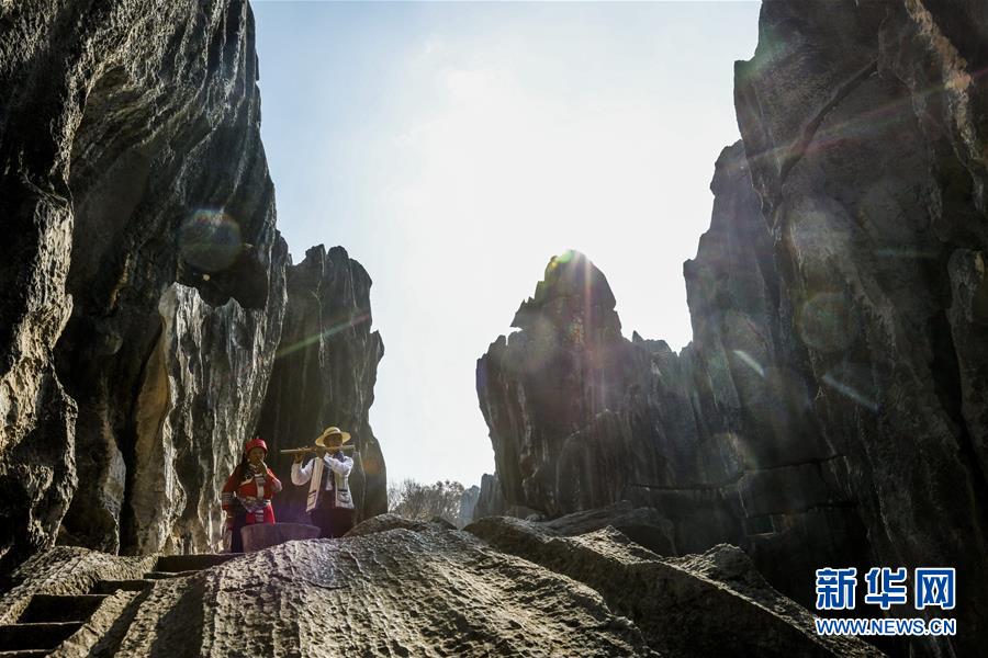 當(dāng)?shù)厣贁?shù)民族樂(lè)手在石林景區(qū)演奏民族音樂(lè)(11月27日攝)。新華社記者蘭紅光攝