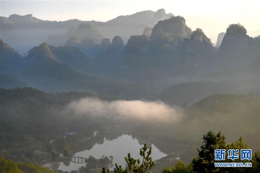 福建省武夷山的茶山云霧繚繞,在朝陽照射下如夢如幻(11月17日攝)。新華社記者宋為偉攝