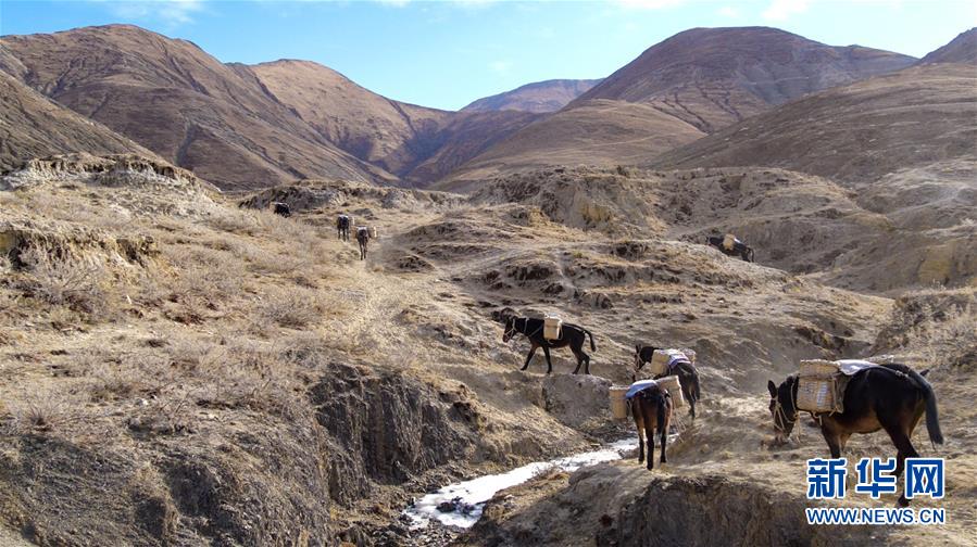 12月6日,騾馬隊(duì)馱負(fù)工程物料前往山頂塔基施工現(xiàn)場(chǎng)。新華社記者李楨宇攝