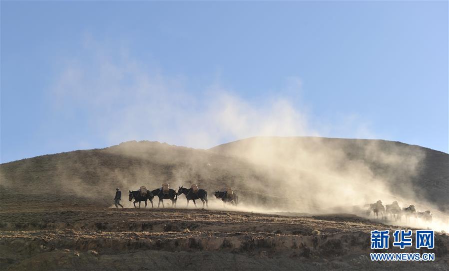 12月6日,向山頂塔基施工現(xiàn)場(chǎng)馱負(fù)工程物料的騾馬隊(duì)在夕陽(yáng)下卸貨歸來(lái)。新華社記者侯捷攝