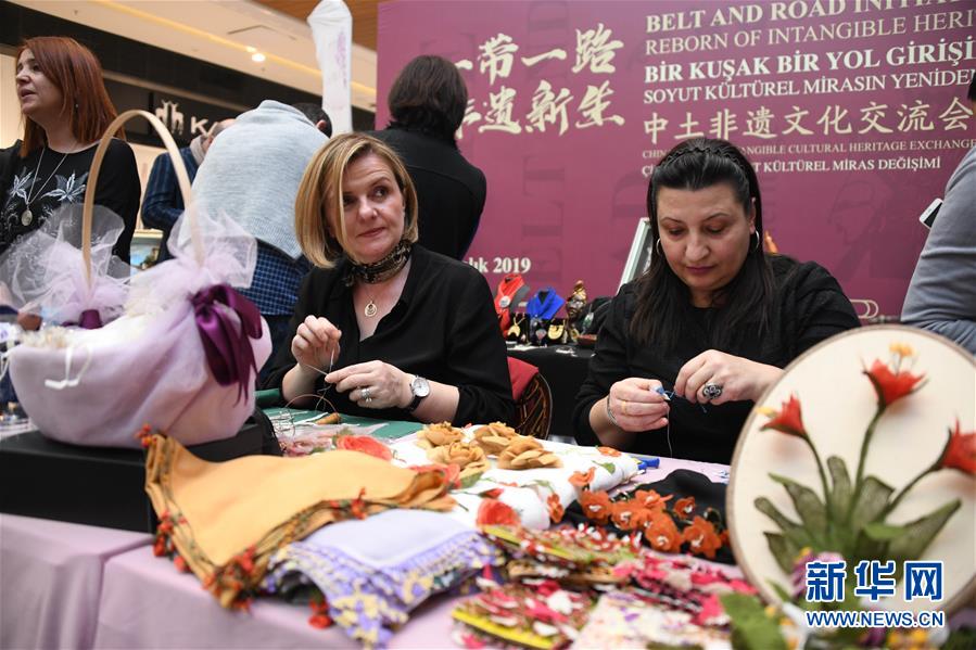 12月6日,在土耳其伊斯坦布爾,土耳其女性非物質(zhì)文化遺產(chǎn)傳承人在交流會上展示非物質(zhì)文化遺產(chǎn)。新華社記者徐速繪攝