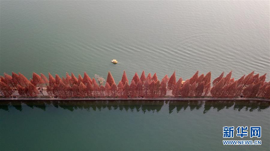 12月10日,一只小船在湖南烈士公園年嘉湖湖面行駛時(shí)經(jīng)過游道(無人機(jī)拍攝)。新華社記者陳澤國攝
