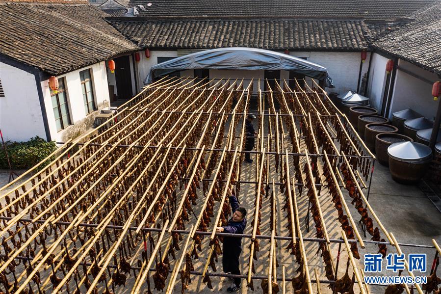 12月3日,安昌古鎮(zhèn)傳統(tǒng)臘味作坊里曬滿了各種手工制作的紹興臘味(無人機(jī)拍攝)。新華社記者徐昱攝