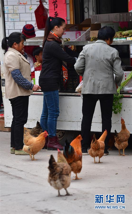 在鹿寨縣拉溝鄉(xiāng)木龍村,李柳萍(右二)在采購(gòu)鄉(xiāng)村土特產(chǎn)(12月14日攝)。新華社記者黃孝邦攝