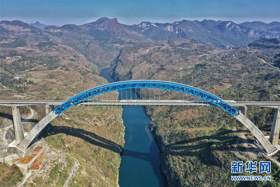 12月16日,一列動車組列車從成貴高鐵鴨池河特大橋上駛過(無人機(jī)拍攝)。新華社記者歐東衢攝