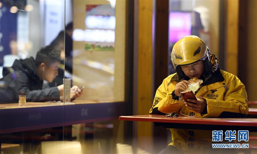 1月27日晚,送餐的間隙,來自湖南岳陽的“外賣小哥”丁鴻在一家餐廳外一邊啃面包一邊看手機。臨近春節(jié),萬家團(tuán)圓,而城市里的外賣配送員仍然騎行在街頭巷尾,將美食和春節(jié)祝福一起準(zhǔn)時送達(dá)。新華社記者李尕攝