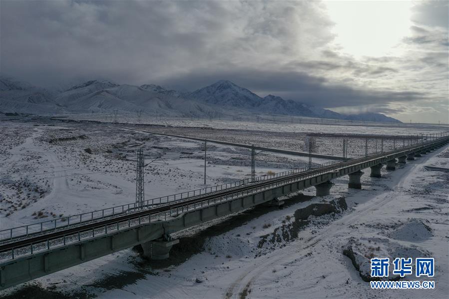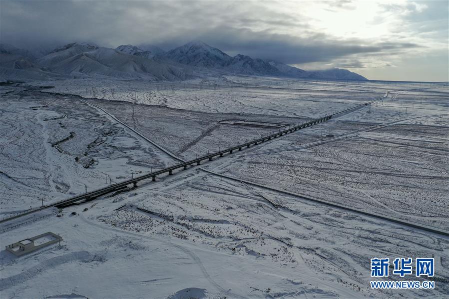 這是12月16日無人機拍攝的敦煌鐵路大柴旦站附近的一處鐵路橋。新華社記者張龍攝