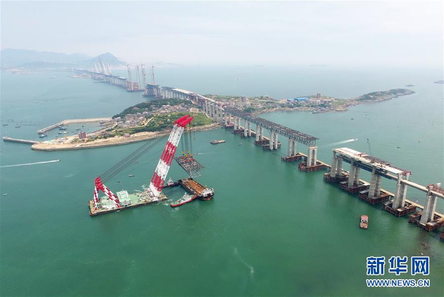 5月12日,“大橋海鷗號”起重船在吊裝一孔簡支鋼桁梁(無人機拍攝)。新華社記者林善傳攝