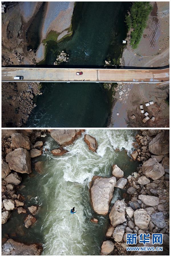 拼版照片:上圖為貴州省威寧縣海拉鎮(zhèn)海元村“溜索改橋”后的場景(2018年3月12日無人機(jī)拍攝);下圖為貴州省威寧縣海拉鎮(zhèn)花果村的村民利用尚未拆除的溜索過江(2018年3月12日無人機(jī)拍攝)。
