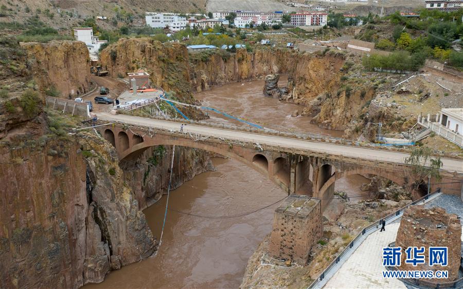 這是10月23日在芒康縣如美鎮(zhèn)無人機拍攝的318國道瀾滄江上的竹卡大橋。新華社記者江宏景攝