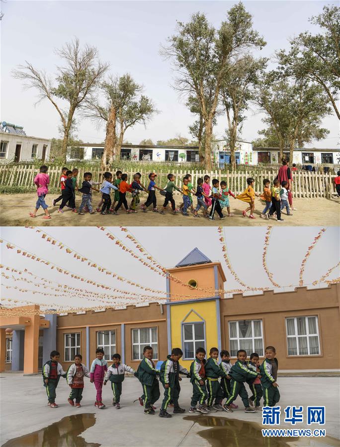 拼版照片:上圖為新疆于田縣達里雅布依鄉(xiāng)小學的學生走在校園里(2018年9月5日攝);下圖為學生們在達里雅布依小鎮(zhèn)易地扶貧安置點的新校舍前(2019年3月20日攝)。新華社記者胡虎虎攝