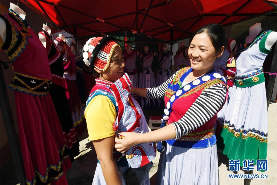 11月2日,云南福貢縣鹿馬登鄉(xiāng)干布村的傈僳族婦女阿白(右)在展示自己手工制作的服飾。阿白靠傳統(tǒng)服飾制作每年可收入三萬(wàn)多元。新華社記者楊宗友攝