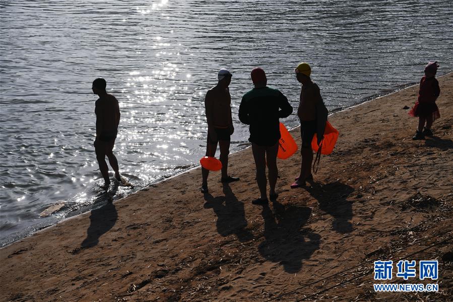12月18日,冬泳愛好者準(zhǔn)備進(jìn)入黃河開始冬泳。新華社記者馬寧攝