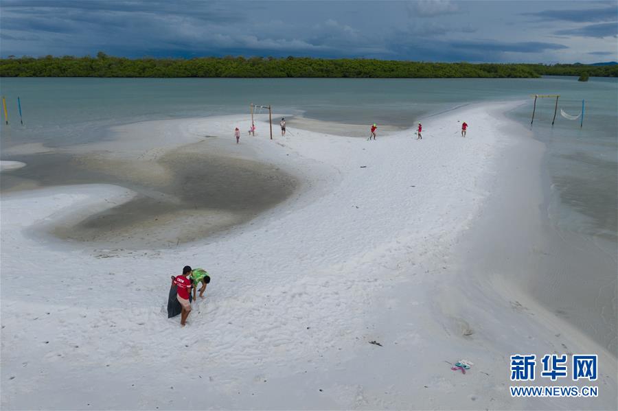 12月8日,在印度尼西亞邦加勿里洞省,李嘉文(左下)帶領(lǐng)工人在李王島的白色海床清理垃圾(無(wú)人機(jī)拍攝)。 新華社記者杜宇攝