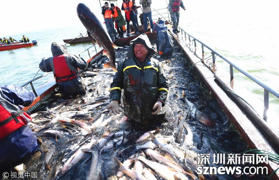 在河南省洛陽(yáng)市嵩縣,第三屆陸渾開(kāi)漁節(jié)啟幕,捕撈隊(duì)員們?cè)诤牧阆率畮锥鹊臏囟认麻_(kāi)始捕魚(yú),收獲新年“第一網(wǎng)”——超10噸魚(yú),現(xiàn)場(chǎng)一派魚(yú)躍人歡的喜悅景象。