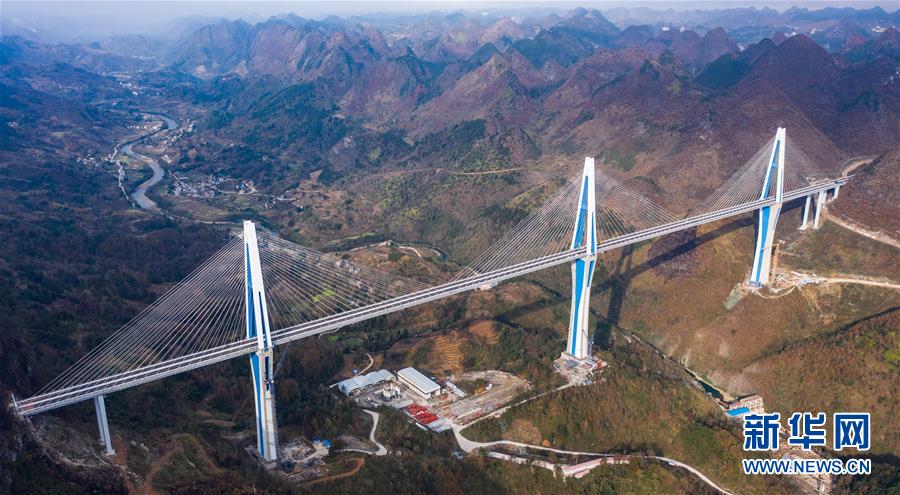 2019年1月7日無人機航拍的平塘特大橋橋塔全景,中為高332米的世界第一高混凝土橋塔。新華社記者歐東衢攝