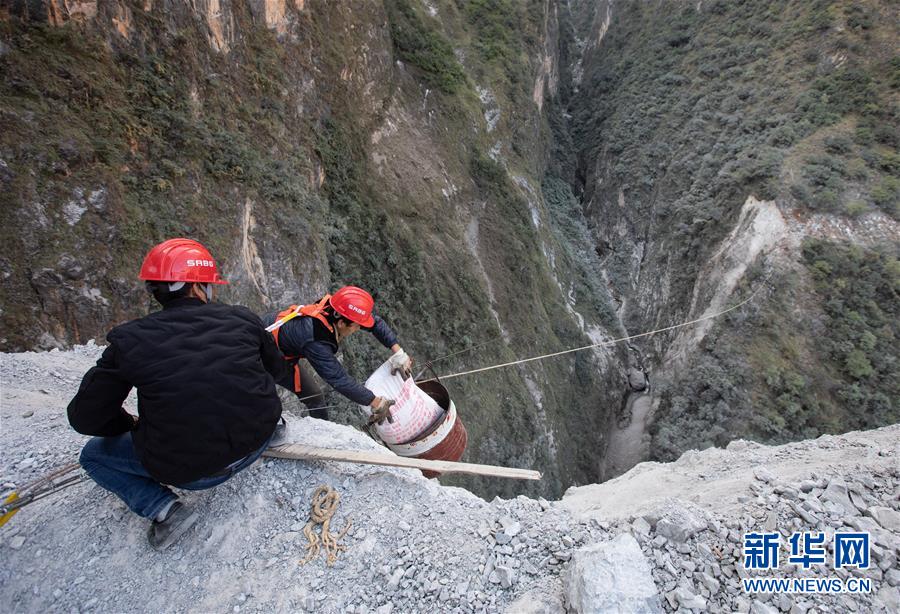 四川路橋的施工人員通過臨時搭建的溜索運(yùn)輸施工物資到峽谷對岸(2019年11月20日攝)。阿布洛哈村通村公路施工遇到陡崖夾溝地勢,項(xiàng)目進(jìn)程艱難緩慢,四川路橋施工隊(duì)伍開始在峽谷兩端分頭推進(jìn)。新華社記者江宏景攝