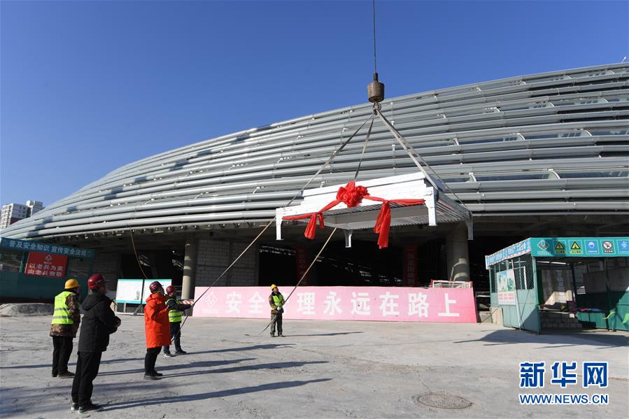 12月31日,施工人員在國家速滑館施工現(xiàn)場起吊最后一塊待安裝的屋面單元板塊。
