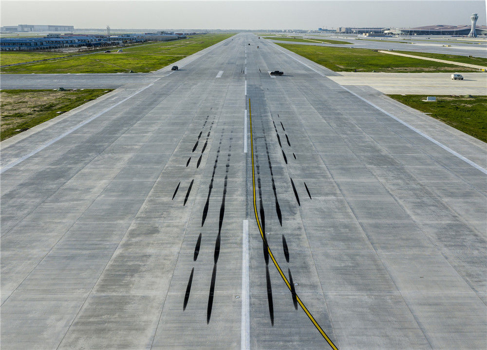 2019年5月29日,北京大興國際機場,飛機在跑道上留下的痕跡。馬文曉/視覺中國
