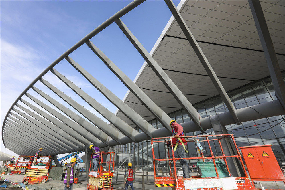 2019年5月24日,北京,新機(jī)場(chǎng)建設(shè)距離竣工時(shí)間還有37天,工程進(jìn)入倒計(jì)時(shí)。機(jī)場(chǎng)開建至今不到5年時(shí)間,機(jī)場(chǎng)施工工程將于6月底竣工,將于9月底投入運(yùn)營(yíng),該機(jī)場(chǎng)有望成為世界上規(guī)模最大的機(jī)場(chǎng)之一。任振朝/千龍圖像/視覺(jué)中國(guó)