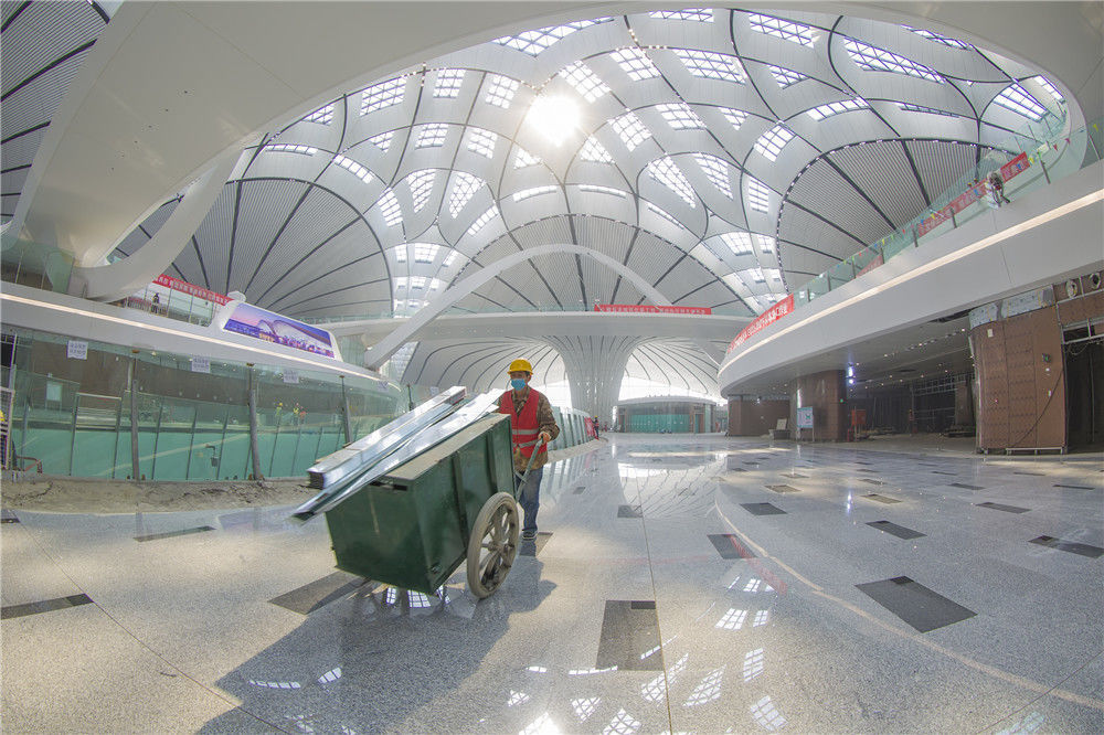 2019年4月26日,北京大興國(guó)際機(jī)場(chǎng)將于9月底正式通航。工程建設(shè)進(jìn)入總攻階段,目前,航站樓內(nèi)部裝飾進(jìn)行收尾的工作。武輝/千龍圖像/視覺(jué)中國(guó)