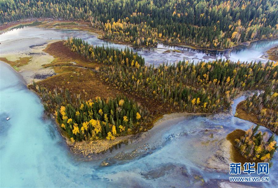 9月24日無人機拍攝的喀納斯景區(qū)風光。新華社記者王菲攝