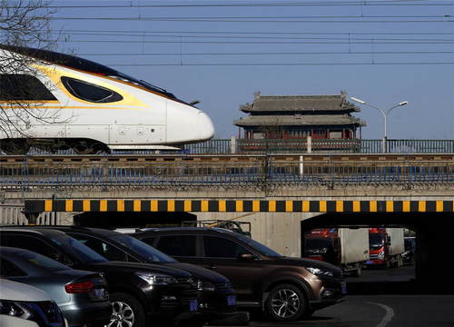 2019年1月25日,一列“復(fù)興號(hào)”動(dòng)車組列車在北京永定門城樓附近的京津城際鐵路上行駛。新華社記者邢廣利攝