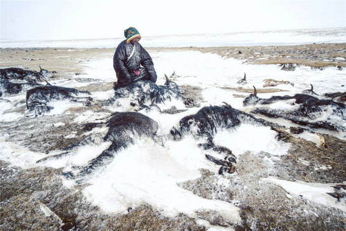 2019年2月23日,青海省玉樹藏族自治州稱多縣扎朵鎮(zhèn)治多村牧民坐在自家被凍死的牦牛前。2018年12月下旬以來(lái),玉樹州境內(nèi)多次大范圍降雪,部分地區(qū)遭受重度、特重度雪災(zāi)。 新華社記者吳剛攝