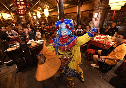 2019年8月4日,食客在四川省成都市寬窄巷子景區(qū)內(nèi)的一家火鍋店觀看“變臉”表演。新華社記者劉坤攝