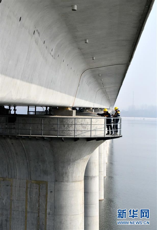 1月3日,中國(guó)鐵路濟(jì)南局臨沂工務(wù)段工程技術(shù)員在沂河特大橋橋墩上檢查。新華社記者 朱崢攝