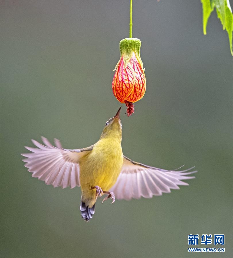 在福州市西湖公園,一只叉尾太陽鳥在狀如燈籠的懸鈴花前懸停、采蜜(1月3日攝)。 叉尾太陽鳥嬌艷靚麗,懸鈴花造型優(yōu)美,花與鳥相映成趣,成為冬季榕城一道美麗的風(fēng)景。叉尾太陽鳥又叫“亞洲蜂鳥”,是福州的“明星鳥”。  新華社記者梅永存攝