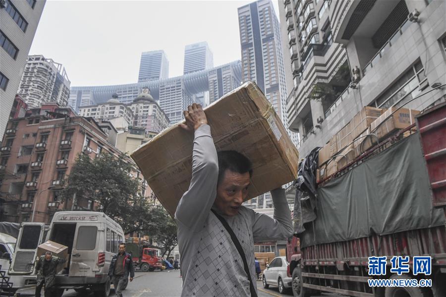 冉光輝在重慶朝天門搬運(yùn)貨物(1月5日攝)。新華社記者王全超攝